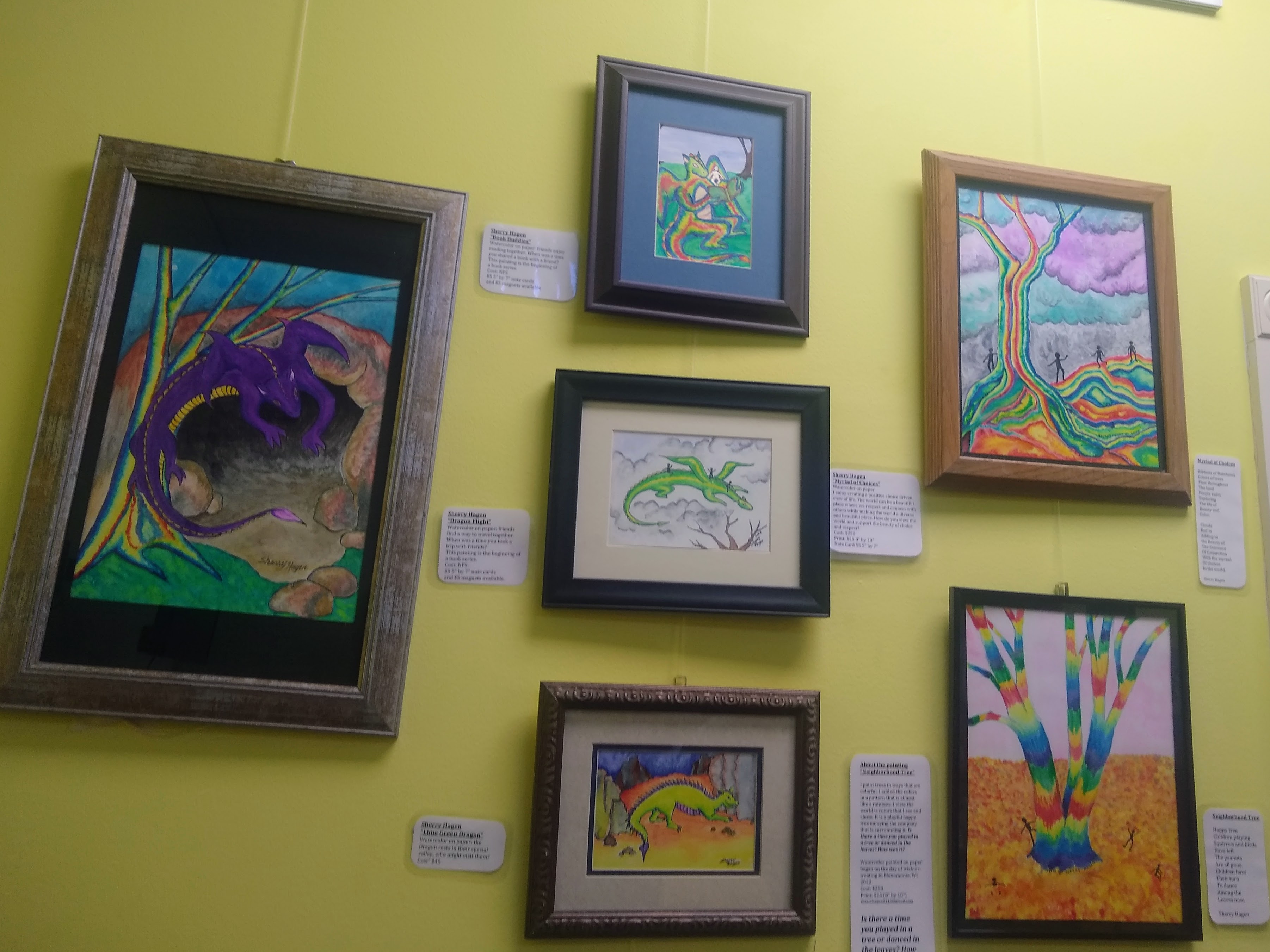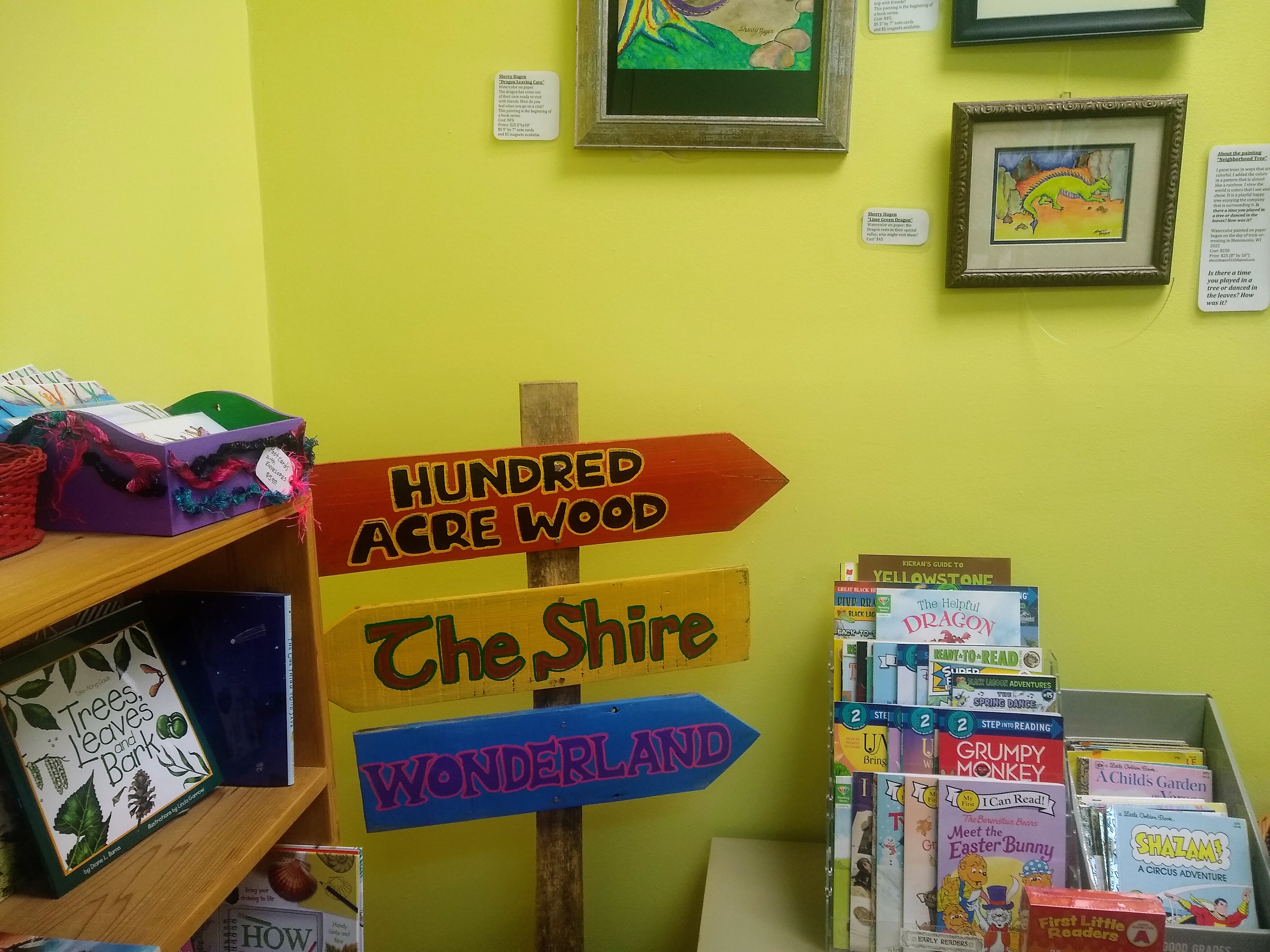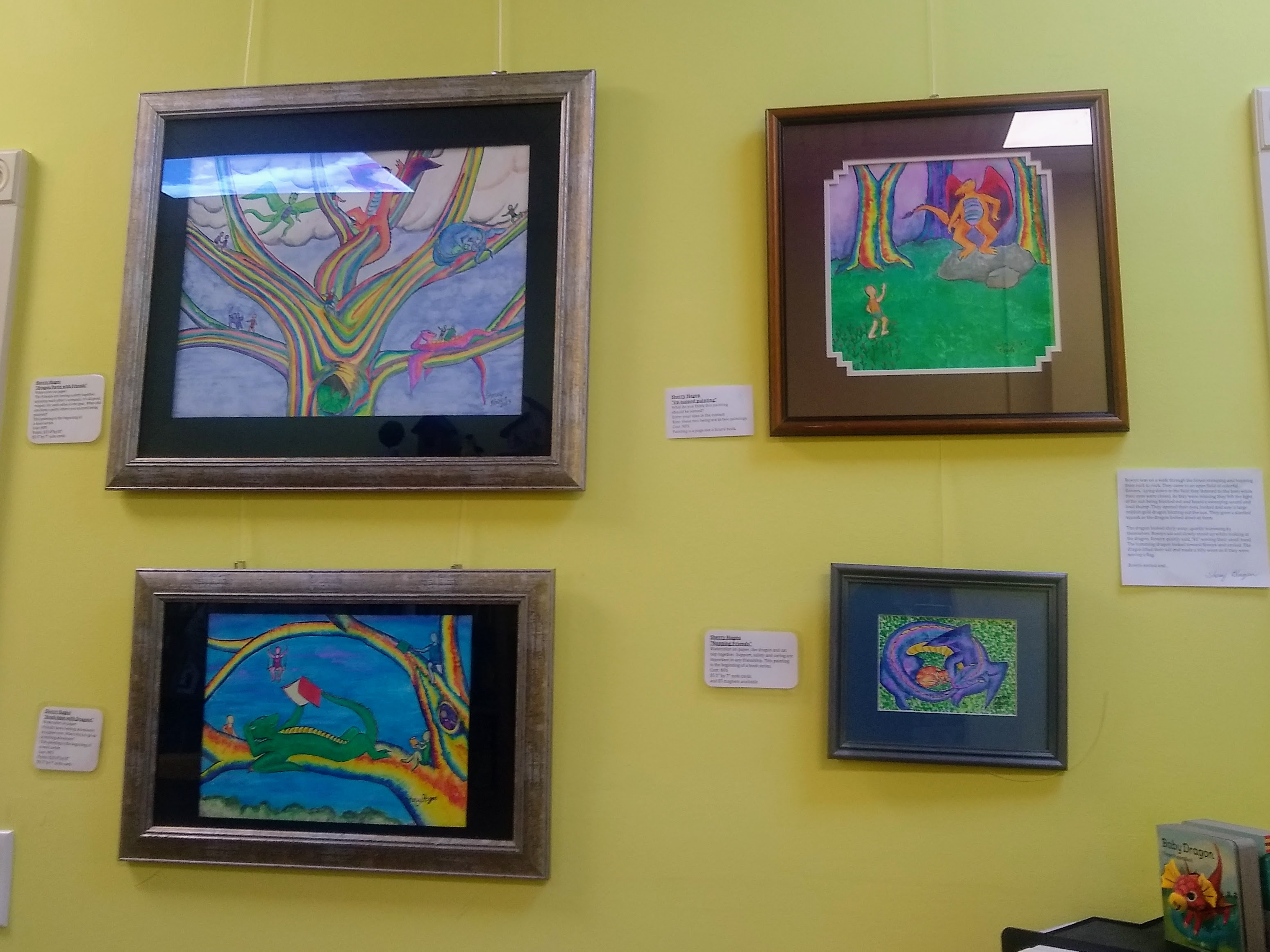 We set up our book-signing operation in the back room, where we spent our free moments pursuing children’s books. I was pleased to see so many Wisconsin authors represented in the collection. Naturally, there were books involving dragons, and I enjoyed the colorful artwork featuring dragons hung on the wall. It was fun to chat with the patrons as they came through the store. Some were even interested in our books. We gave away many bookmarks, which serve very well as business cards for authors.