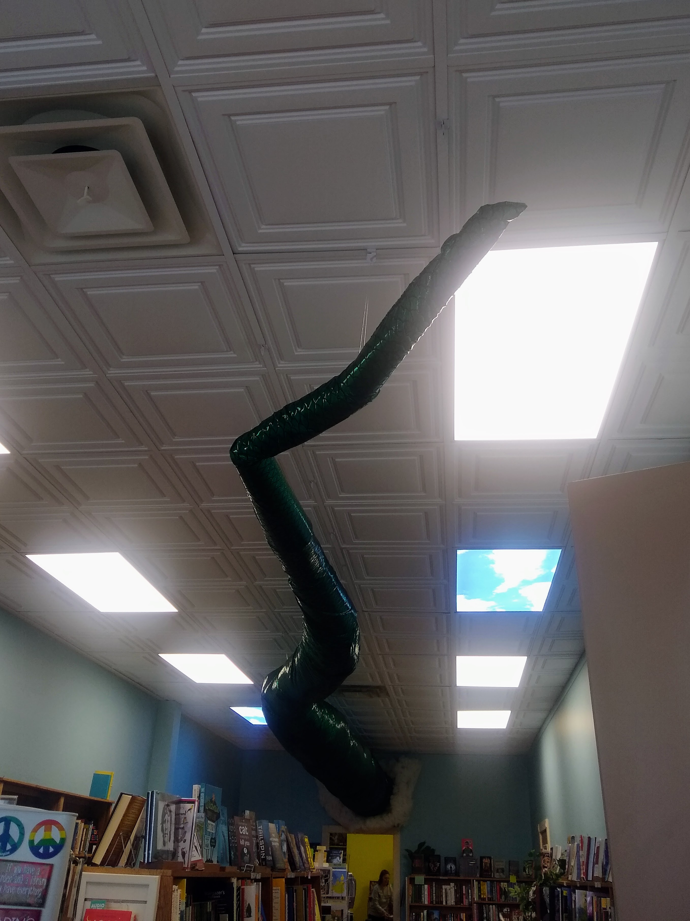 Fellow author Huckleberry Rahr and yours truly hitched a ride on an obliging green dragon to Menomonie, Wisconsin, where Ann Vogl, Chief Dragon-rider, holds down the fort at a lovely independent bookstore called Dragon Tale Books. Intermittent rainfall made travel a little dicey, but our noble steed kept us safe and dry all the way there. The latter feat was achieved with the assistance of a red phoenix who accompanies Huckle everywhere on her journeys.